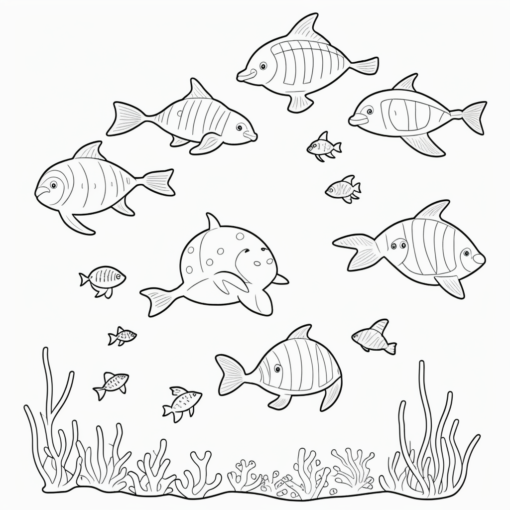 Dive into a captivating world of friendly sea creatures with our unique coloring book page. Featuring delightful fish, turtles, and dolphins swimming among coral and bubbles, this simple line art provides endless fun for kids and adults alike. Embrace the tranquility of the ocean as you bring these charming black and white outlines to life. Perfect for relaxation and creativity, this page invites you to explore your artistic side in a peaceful, underwater setting. Let your imagination run wild!
